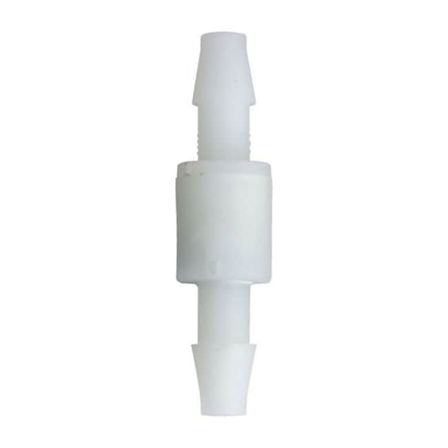 1/4" Hose Barb Check Valve, 3 psi Cracking Pressure 302 Stainless Steel Spring, 316 Stainless Steel Ball, Viton Seals, Natural Polypropylene.Safety is paramount when working with glass vessels that see pressure.Hydrophobic vent filters can become blocked due to moisture form the vessel contents. This results in a higher-than-normal back pressure and an increased chance for the vessel or other system components to fail.The pressure relief valve should be used in situations where the glass vessel could see pressure.The valve is a one-way or non-return device to let gas flow in one direction above a fixed pressure level.It is attached by silicone or comparable tubing to one of the vessels head plate ports. If the pressure inside the vessel reaches 3 PSIG, the valve will open and then close when the pressure falls below 3 PSIG.The housing cannot be opened nor can the pressure setting be adjusted.