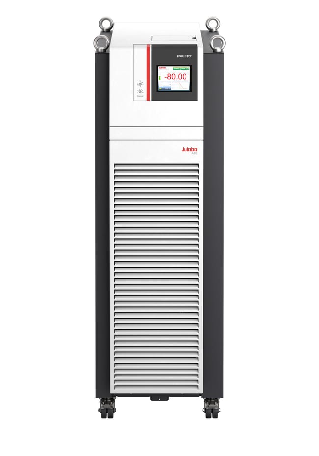 JULABO PRESTO Highly Dynamic Temperature Control Systems for highly precise temperature control of external applications Systems offer rapid heating and cooling rates The hydraulically sealed heat exchanger design affords a wide working temperature range without changing fluids All units feature a color TFT touch screen interface for unit operation external integration and programming Instruments cover a working temperature range of -85 to 250C Up to three user levels with password management Systems incorporate USB (host and device) Ethernet SD-card slot RS232 port stand-by input and Pt100 external temperature sensor port The graphite bearing centrifugal pressure pump is lubricated by the bath fluid All models (except for A30) can operate under pressure control to safeguard pressure sensitive applications (such as jacketed glass reactors) Air and water-cooled versions available Additional accessories available