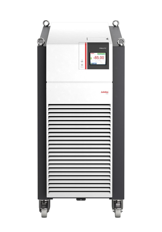 JULABO PRESTO Highly Dynamic Temperature Control Systems for highly precise temperature control of external applications Systems offer rapid heating and cooling rates The hydraulically sealed heat exchanger design affords a wide working temperature range without changing fluids All units feature a color TFT touch screen interface for unit operation external integration and programming Instruments cover a working temperature range of -85 to 250C Up to three user levels with password management Systems incorporate USB (host and device) Ethernet SD-card slot RS232 port stand-by input and Pt100 external temperature sensor port The graphite bearing centrifugal pressure pump is lubricated by the bath fluid All models (except for A30) can operate under pressure control to safeguard pressure sensitive applications (such as jacketed glass reactors) Air and water-cooled versions available Additional accessories available