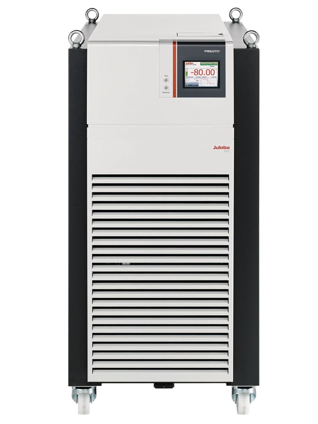 JULABO PRESTO Highly Dynamic Temperature Control Systems for highly precise temperature control of external applications Systems offer rapid heating and cooling rates The hydraulically sealed heat exchanger design affords a wide working temperature range without changing fluids All units feature a color TFT touch screen interface for unit operation external integration and programming Instruments cover a working temperature range of -85 to 250C Up to three user levels with password management Systems incorporate USB (host and device) Ethernet SD-card slot RS232 port stand-by input and Pt100 external temperature sensor port The graphite bearing centrifugal pressure pump is lubricated by the bath fluid All models (except for A30) can operate under pressure control to safeguard pressure sensitive applications (such as jacketed glass reactors) Air and water-cooled versions available Additional accessories available