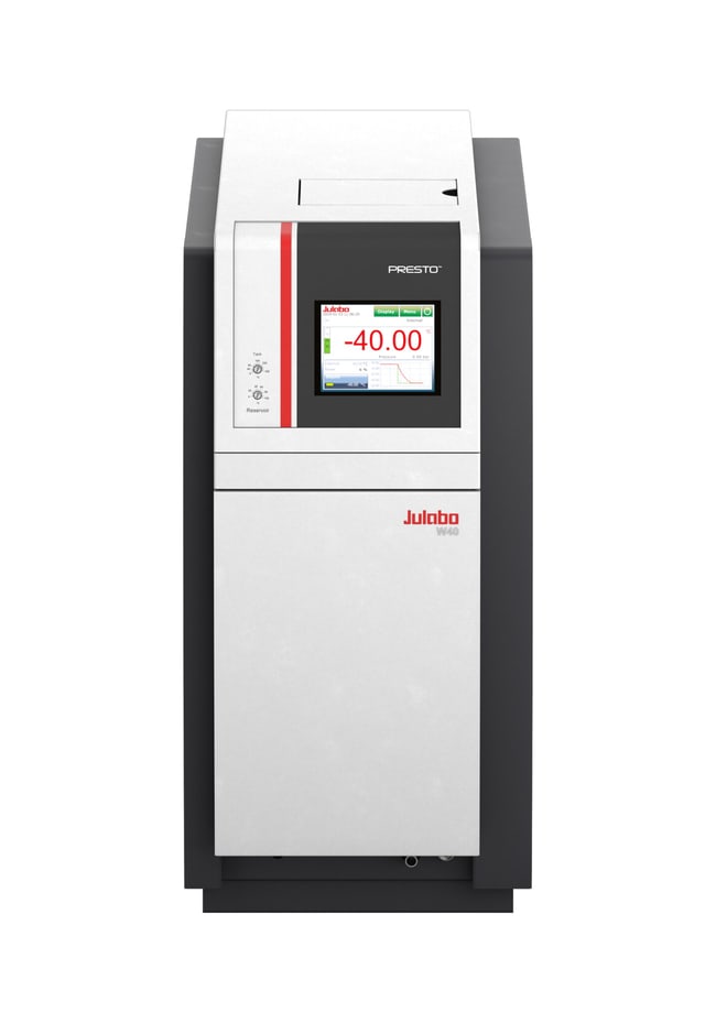 JULABO PRESTO Highly Dynamic Temperature Control Systems for highly precise temperature control of external applications Systems offer rapid heating and cooling rates The hydraulically sealed heat exchanger design affords a wide working temperature range without changing fluids All units feature a color TFT touch screen interface for unit operation external integration and programming Instruments cover a working temperature range of -85 to 250C Up to three user levels with password management Systems incorporate USB (host and device) Ethernet SD-card slot RS232 port stand-by input and Pt100 external temperature sensor port The graphite bearing centrifugal pressure pump is lubricated by the bath fluid All models (except for A30) can operate under pressure control to safeguard pressure sensitive applications (such as jacketed glass reactors) Air and water-cooled versions available Additional accessories available