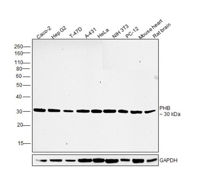 MA5-15899 targets PHB in indirect ELISA, FACS, ICC, IHC, IF and WB applications and shows reactivity with Human, mouse, Non-human primate, and Rat samples. The MA5-15899 immunogen is purified recombinant fragment of human PHB expressed in E. Coli. . MA5-15899 detects PHB which has a predicted molecular weight of approximately 30kDa.