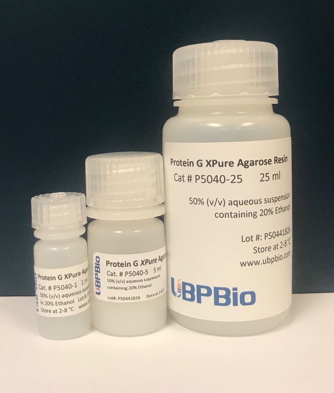 Protein Purification Reagents – Protein G Resin (UBPBio catalog# P5040-1, P5040-5, P5040-25) – Protein G XPure Agarose Resin consists of recombinant protein G covalently bound to crosslinked agarose beads, which minimizes leakage of Protein A/G and allow reuse the resin. The protein G resin has a binding capacity of ~ 20 mg human IgG/ml resin and works well in batch or FPLC column purifications.