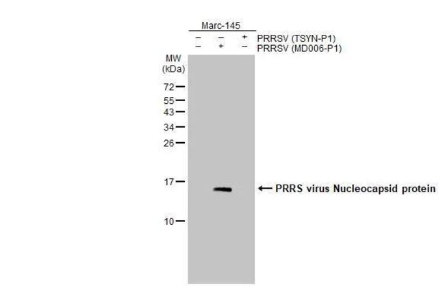 PRRSV Nucleocapsid Monoclonal antibody specifically detects PRRSV Nucleocapsid in Virus samples. It is validated for Western Blot, Immunocytochemistry/ ImmunofluorescenceSpecifications