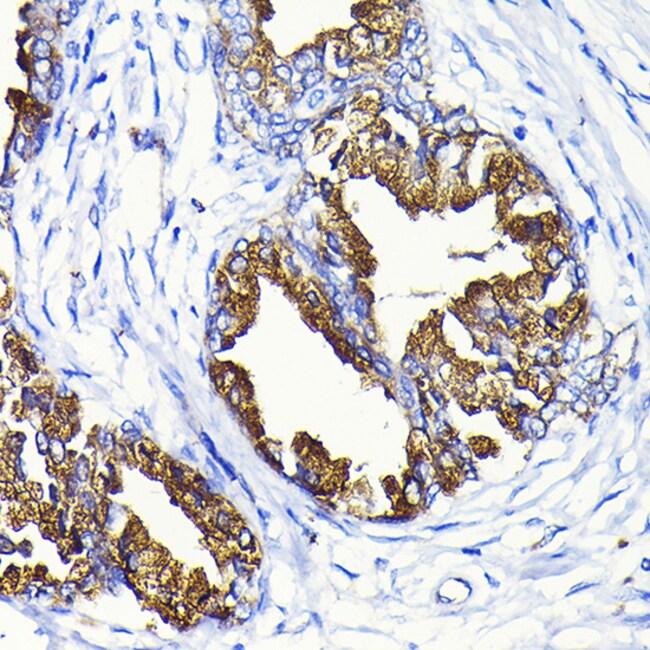 PSA is a chymotrypsin-like serine protease (kallikrein family) produced by the prostate epithelium, and is abundant in seminal fluid. PSA can be detected in the sera of patients with prostatic carcinoma. It is predominantly complexed to a liver-derived serine protease inhibitor, alpha-1-antichymotrypsin (ACT). A higher proportion of serum PSA is complexed to ACT in prostate cancer than in benign prostate hyperplasia. PSA is used to confirm prostatic acinar cell origin in primary and metastatic carcinoma and to rule out non-prostatic carcinoma mimics.