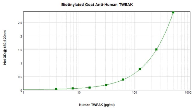 AA Sequence of recombinant protein: MKGRKTRARR AIAAHYEVHP RPGQDGAQAG VDGTVSGWEE ARINSSSPLR YNRQIGEFIV TRAGLYYLYC QVHFDEGKAV YLKLDLLVDG VLALRCLEEF SATAASSLGP QLRLCQVSGL LALRPGSSLR IRTLPWAHLK AAPFLTYFGL FQVH. Preparation: Produced from sera of goats immunized with highly pure Recombinant Human TWEAK. Anti-Human TWEAK-specific antibody was purified by affinity chromatography and then biotinylated. Sandwich ELISA: To detect Human TWEAK by sandwich ELISA (using 100 μL/well antibody solution) a concentration of 0.25-1.0 μg/mL of this antibody is required. This biotinylated polyclonal antibody, in conjunction with PeproTech Polyclonal Anti-Human TWEAK (500-P137G) as a capture antibody, allows the detection of at least 0.2-0.4 ng/well of Recombinant Human TWEAK. Western Blot: To detect hTWEAK by Western Blot analysis this antibody can be used at a concentration of 0.1-0.2 μg/mL. Used in conjunction with compatible secondary reagents the detection limit for Recombinant hTWEAK is 1.5-3.0 ng/lane, under either reducing or non-reducing conditions. 500-P137GBT-1MG will be provided as 2 x 500 μg