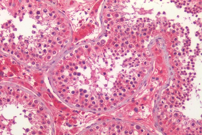 Percent identity with other species by BLAST analysis: Human, Gorilla, Gibbon, Monkey, Marmoset, Rat, Bovine, Dog, Elephant, Panda, Rabbit, Horse, Pig, Opossum, Turkey, Chicken, Platypus, Pufferfish, Zebrafish, Stickleback (100%); Mouse, Xenopus, Pike (93%). For IHC(P), use heat induced antigen retrieval in pH 6.0 citrate buffer. After incubation with the primary antibody, slides were incubated with biotinylated secondary antibody, followed by alkaline phosphatase-streptavidin and chromogen.