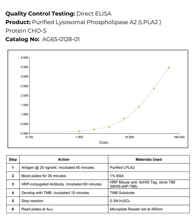 Recombinant CHO Lysosomal Phospholipase A2 (LPLA2, UniProt # G3HKV9) with a 6xHIS tag was expressed in CHO-S cells and purified by nickel affinity chromatography. The product is determined to be >95% pure based on SDS-PAGE analysis and western blot. Under reducing conditions, CHO LPLA2 is detected at an estimated molecular weight of 56 kDa. Its concentration is determined using a Bradford protein assay BSA standard curve and A280. Optimal working dilutions should be determined experimentally by the investigator.