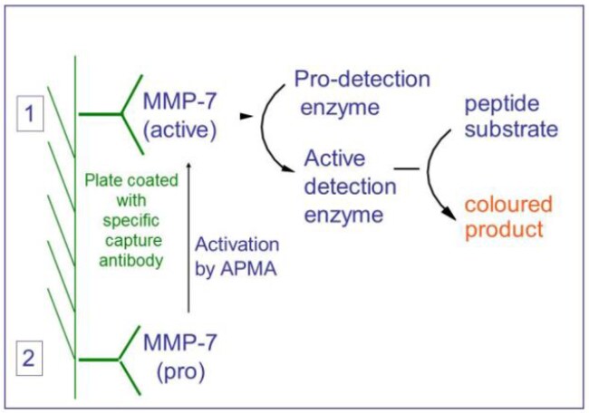 The QuickZyme Human MMP-7 Activity Assay is an enzyme activity immunoassay that enables you to specifically measure both endogenous active MMP-7 and total active MMP-7 (following activation of pro-MMP-7 on the plate with APMA). It can be used for the measurement of MMP-7 activity in various biological samples, such as conditioned culture media, tissue homogenates, serum, plasma and urine. This 96-well plate format assay is based on the QuickZyme technology, using a modified pro-enzyme as a substrate, which upon activation is able to release color from a chromogenic peptide substrate. This multiplication step provides a unique assay sensitivity. ASSAY RANGE: 0.004 ¿ 16 ng/ml. SENSITIVITY: 30 pg/ml (3 h incubation); 4 pg/ml (25 h incubation). SYNONYMS: Matrix metalloproteinase-7, MMP7, Matrilysin, Matrilysin-1, Matrin, Pump-1 protease, Uterine metalloproteinase.