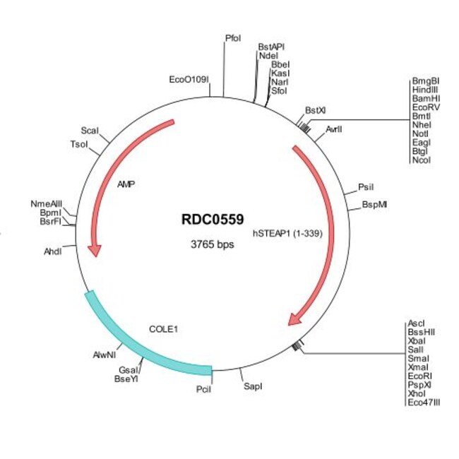 The Human STEAP1 (NP_036581) VersaClone cDNA clone contains the complete ORF for STEAP1, along with a Kozak consensus sequence for optimal translation initiation. The gene insert is flanked with convenient multiple cloning sites which can be used to easily cut and transfer the gene cassette into your desired expression vector. The STEAP1 insert is sequence verified and the entire plasmid DNA and insert translated sequences are provided.