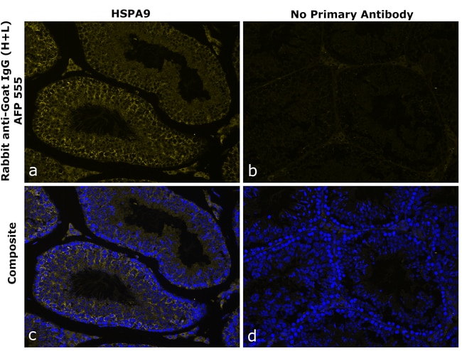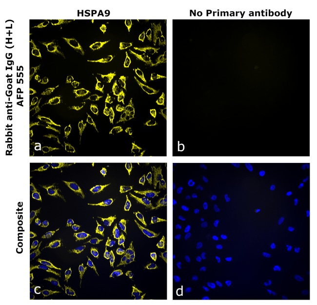The Rabbit anti-Goat IgG (H+L) Superclonal™ Recombinant Secondary Antibody, Alexa Fluor™ Plus 555 specifically detects the heavy and the light chains of goat IgG. It has ~20% cross reactivity to Hamster IgG and showed minimum to no cross-reactivity to various species immunoglobulins tested. This recombinant antibody has been engineered with point mutations that eliminate binding to Fc receptors, enabling reduction in background and superior signal to noise. The sensitivity and specificity of each lot is confirmed using ELISA. Superclonal™ recombinant secondary antibodies are produced using a multifaceted clonal selection process that involves several phenotypic screens to ensure enhanced specificity, animal origin free formulation and lot-to-lot consistency. Alexa Fluor™ Plus dyes have been chemically optimized to provide higher signal to noise ratios and minimized cross-reactivity to help detect low-abundance targets in rare or precious samples. It is recommended that the antibody be carefully titrated for optimal performance in the assay of interest.