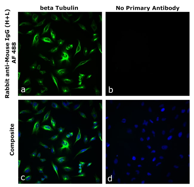 Rabbit anti-Mouse IgG (H+L) Superclonal™ Recombinant Secondary Antibody, Alexa Fluor™ 488 can detect both Fab2 and Fc region of Mouse IgG. It can also detect all subtypes of Mouse IgG (Mouse IgG1,2a,2b and 3). It has <20% cross reactivity to Human IgG and Rat IgM. It showed minimum to no cross-reactivity to various species immunoglobulins tested. This recombinant antibody has been engineered with point mutations that eliminate binding to Fc receptors, enabling reduction in background and superior signal to noise. Superclonal™ recombinant secondary antibodies are produced using a multifaceted clonal selection process that involves several phenotypic screens to ensure enhanced specificity, animal origin free formulation and lot-to-lot consistency. Protein conjugates made with Alexa Fluor™ dyes produce fluorescence output that surpasses that of other spectrally similar fluorophore-labeled proteins. Alexa Fluor™ dyes are available in a wide selection of fluorescent colors and are more photostable than most other dyes. Photostability is a key characteristic of Alexa Fluor dye™ conjugates, allowing more time for image capture. In addition to their exceptional brightness and the wide selection of dyes across the spectrum, you'll get photostability you can rely on with Alexa Fluor™ dyes and dye conjugates. It is recommended that the antibody be carefully titrated for optimal performance in the assay of interest.