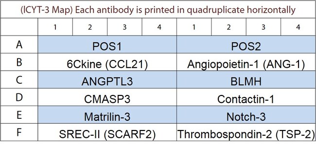 Detects 10 Rabbit Cytokines. Suitable for all liquid sample types. Semi-Quantitative, Sandwich-based, Glass Slide Antibody Array Screen and compare protein expression levels with high specificity and sensitivity (pg/ml levels). The glass slide array allows for high throughput and low sample consumption; as little as 10 µl of original sample required per array. Proteins detected: 6Ckine (CCL21), Angiopoietin-1 (ANG-1), ANGPTL3, BLMH, CMASP3, Contactin-1, Matrilin-3, Notch-3, SREC-II (SCARF2), Thrombospondin-2 (TSP-2)