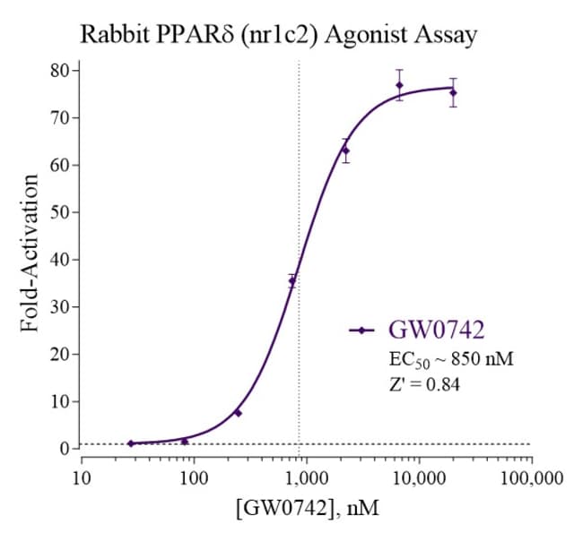 Eliminate weeks of cell culture while achieving superior sensitivity with reproducible results from this all-inclusive cell-based luciferase reporter assay. INDIGO’s Rabbit Peroxisome Proliferator-Activated Receptor delta (rPPARd, NR1C2) reporter assay allows you to quickly screen test samples to quantify functional activity, either agonist or antagonist, they may exert against Rabbit PPARd. Kit includes cryopreserved reporter cells engineered to provide constitutive expression of the receptor, optimized media for use during cell thawing and in diluting test samples, reference agonist, Luciferase Detection Reagent, cell culture-ready assay plate, and detailed assay protocol. INDIGO’s unique Cryomite™ process provides exceptional cell viability post-thaw and INDIGO’s strict QA process means consistent results lot to lot (product quality data available upon request). This kit allows researchers to achieve superior sensitivity, clear,and reproducible results.
