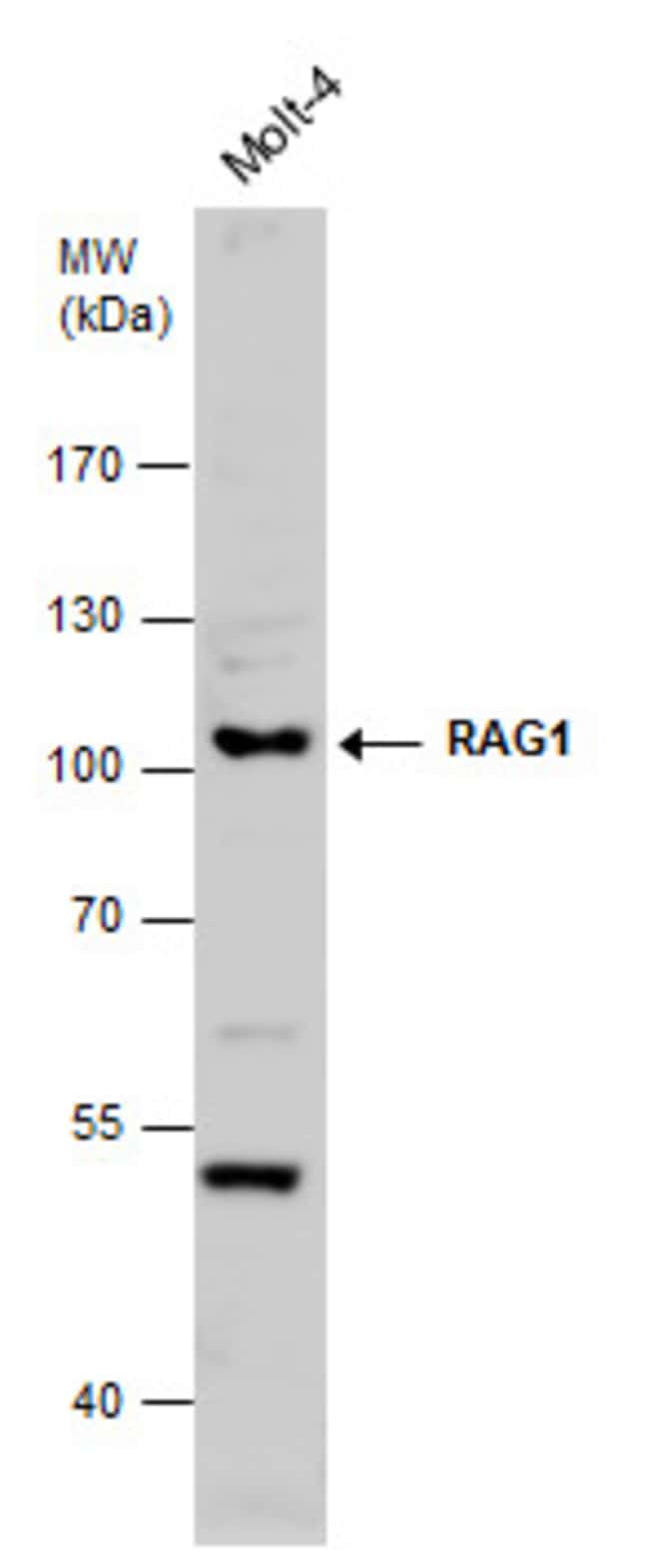 Recombinant protein encompassing a sequence within the C-terminus region of human RAG1. The exact sequence is proprietary. | |