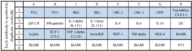 Detects 19 Rat Cytokines. Suitable for all liquid sample types. Semi-Quantitative, Sandwich-based, Membrane Antibody Array. Screen and compare protein expression levels with high specificity and sensitivity (pg/ml levels). No dedicated equipment required. Compatible with any chemiluminescent imaging system. Proteins detected: CINC-2, CINC-3, CNTF, Fractalkine (CX3CL1), GM-CSF, IFN-gamma, IL-1 alpha (IL-1 F1), IL-1 beta (IL-1 F2), IL-4, IL-6, IL-10, LIX, Leptin, MCP-1 (CCL2), MIP-3 alpha (CCL20), beta-NGF, TIMP-1, TNF alpha, VEGF-A