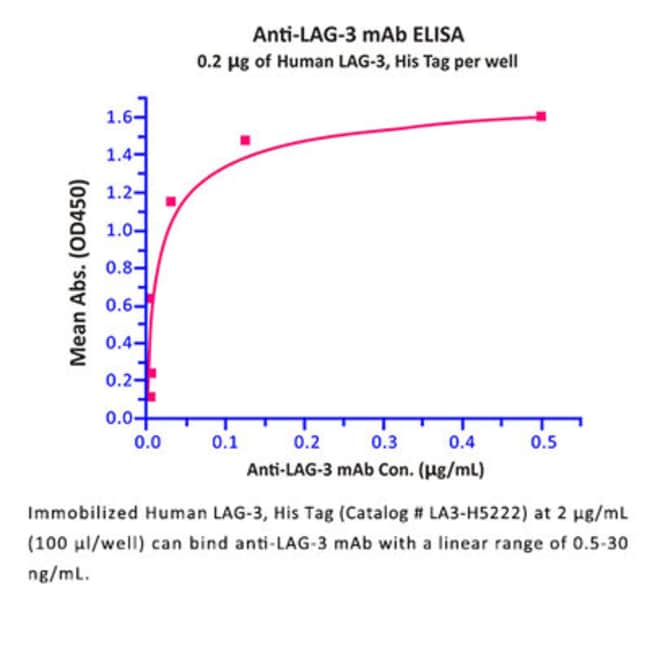 Recombinant Protein;Human LAG-3 / CD223 Protein;100UG;Human LAG-3, His Tag (LA3-H5222) is expressed from human 293 cells (HEK293). It contains AA Leu 23 - Leu 450 (Accession # P18627).;This protein carries a polyhistidine tag at the C-terminus, and has a calculated MW of 47.1 kDa. The predicted N-terminus is Leu 23. The reducing (R) protein migrates as 55-60 kDa in SDS-PAGE due to glycosylation.;Immobilized Anti-Human LAG3 MAb, Human IgG1 at 2μg/mL (100 μL/well) can bind Human LAG-3, His Tag (Cat. No. LA3-H5222) with a linear range of 1-6 ng/mL (QC tested).