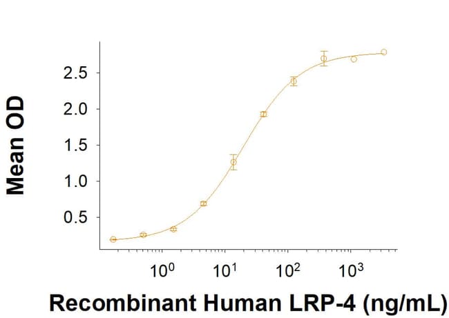 Measured by its binding ability in a functional ELISA. In the presence of Recombinant Human Agrin (Catalog # 6624-AG ), immobilized Recombinant Cynomolgus Monkey MuSK Fc Chimera (Catalog # 11122-MK) at 0.5 μg/mL (100 μL/well) binds Recombinant Human LRP-4 (Catalog # 5948-LR ) with an ED50 of 10.0-80.0 ng/mL.