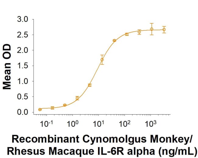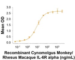 Measured by its binding ability in a functional ELISA. Recombinant Cynomolgus Monkey/Rhesus Macaque IL-6R alpha His-tag (Catalog # 11386-SR) binds Recombinant Human IL-6 (Catalog # 7270-IL ) with an ED50 of 2.00-20.0 ng/mL.