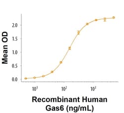 Measured by its binding ability in a functional ELISA. When Recombinant Cynomolgus Monkey/Rhesus Macaque Tyro3/Dtk Fc Chimera (Catalog # 11266-DT) is immobilized at 0.500 μg/mL (100 μL/well), Recombinant Human Gas6 Protein (Catalog # 885-GSB ) binds with an ED50 of 50.0-400 ng/mL.