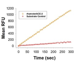 Recombinant Hamster ACE-2 His-tag (Catalog # 10578-ZN) binds Recombinant Viral SARS-CoV-2 S Protein RBD Fc Chimera (Catalog # 10499-CV ) in a functional ELISA. Measured by its ability to cleave a fluorogenic peptide substrate, Mca-YVADAPK(Dnp)-OH (Catalog # ES007 ). The specific activity is >700 pmol/min/μg, as measured under the described conditions.