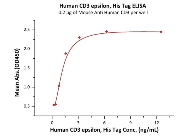 Recombinant human CD3 epsilon protein (Active) is a Human Fragment protein, in the 23 to 126 aa range, expressed in HEK 293, with >90% purity, < 1 EU/µg endotoxin level and suitable for SDS-PAGE, FuncS.
