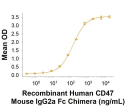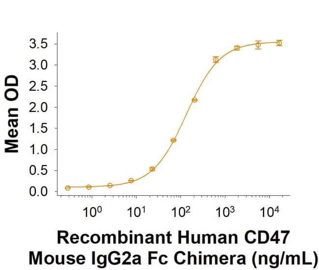 Measured by its binding ability in a functional ELISA. When Recombinant Human SIRP alpha/CD172a Fc Chimera (Catalog # 4546-SA ) is immobilized at 0.2 μg/mL (100 μL/well), Recombinant Human CD47 Mouse IgG2a Fc Chimera (Catalog # 10673-CD) binds with an ED50 of 30.0-300 ng/mL.