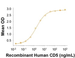 Measured by its binding ability in a functional ELISA. Recombinant Human CD5 Fc Chimera (Catalog # 11389-CD) binds to Human CD5 Antibody (Catalog # MAB16361 ) with a ED50 of 0.800-8.00 ng/mL.