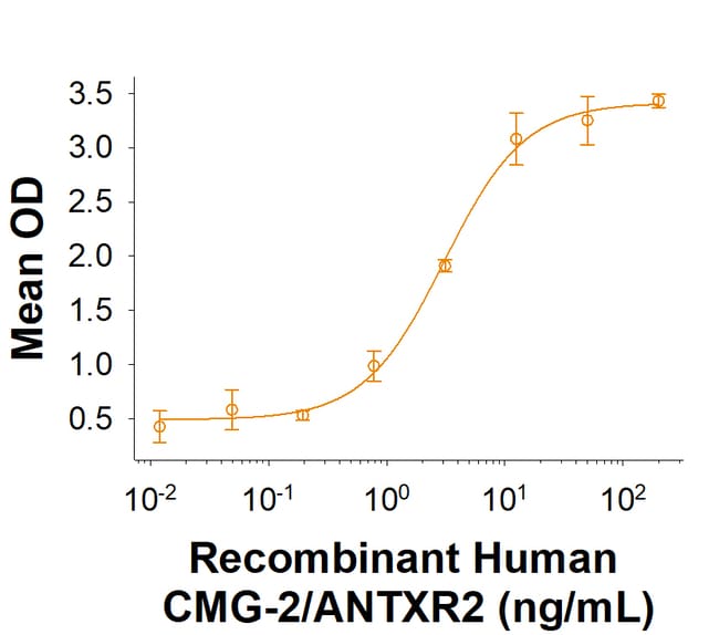 When Anthrax Protective Antigen is immobilized at 1.5 μg/mL (100 μL/well), it binds Recombinant Human CMG-2/ANTXR2 Fc Chimera (Catalog # 10360-AR) with an ED50 of 1-6 ng/mL.