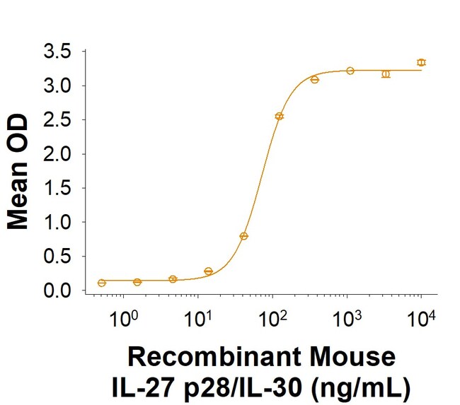 Measured by its binding ability in a functional ELISA. When Recombinant Human EBI3 Protein (Catalog # 11084-EI) is immobilized at 5.0 μg/mL (100 μL/well), the concentration of Recombinant Mouse IL-27 p28/IL-30 Protein (Catalog # 7430-ML ) that produces 50% of the optimal binding response is 40.0-300 ng/mL.