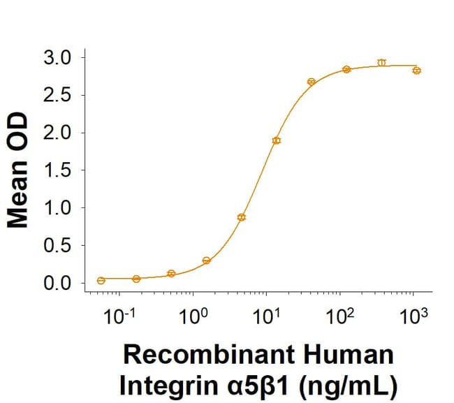| Source | Chinese Hamster Ovary cell line, CHO-derived human Integrin alpha 5 beta 1 protein Human Integrin alpha 5 (Phe42-Tyr995) (N-terminus) Accession # P08648 Acidic Tail Human Integrin beta 1 (Gln21-Asp728) (N-terminus) Accession # P05556 Basic Tail (C-terminus) |