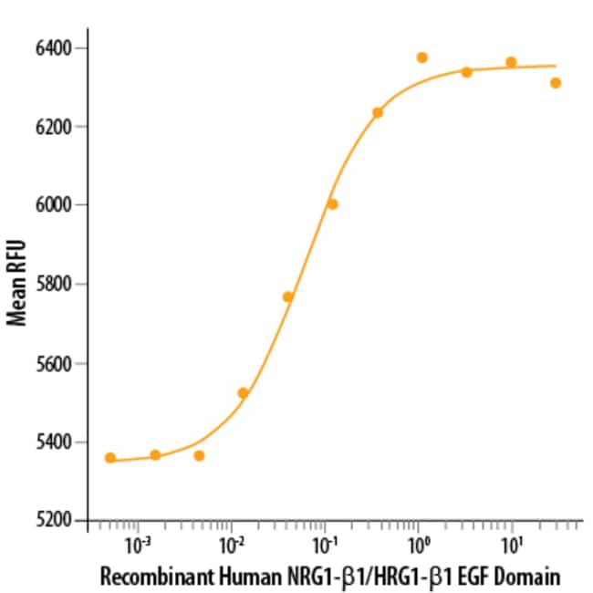 | Source | E. coli-derived human Neuregulin-1 beta 1/NRG1 beta 1 protein Thr176-Lys246 |