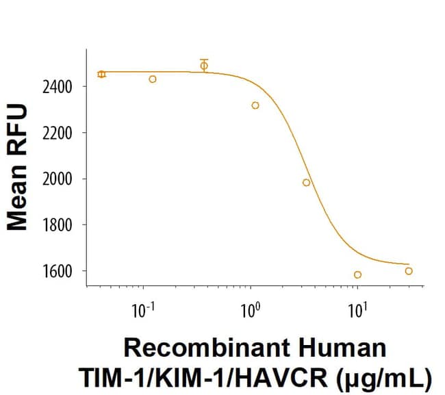 | Source | Human embryonic kidney cell, HEK293-derived human TIM-1/KIM-1/HAVCR protein Human TIM-1/KIM-1/HAVCR (Ser21-Gly295) (C-terminus) Accession # Q96D42.3 IEGRMD Human IgG1 (Pro100-Lys330) (N-terminus) |