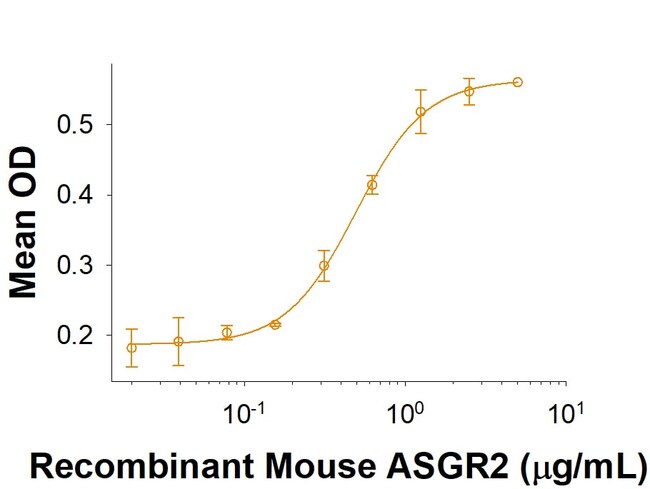 | Source | Chinese Hamster Ovary cell line, CHO-derived mouse ASGR2 protein MDP Mouse IgG2A (Glu98-Lys330) IEGR Mouse ASGR2 (Ser79-His301) (N-terminus) Accession # P24721.1 (C-terminus) |