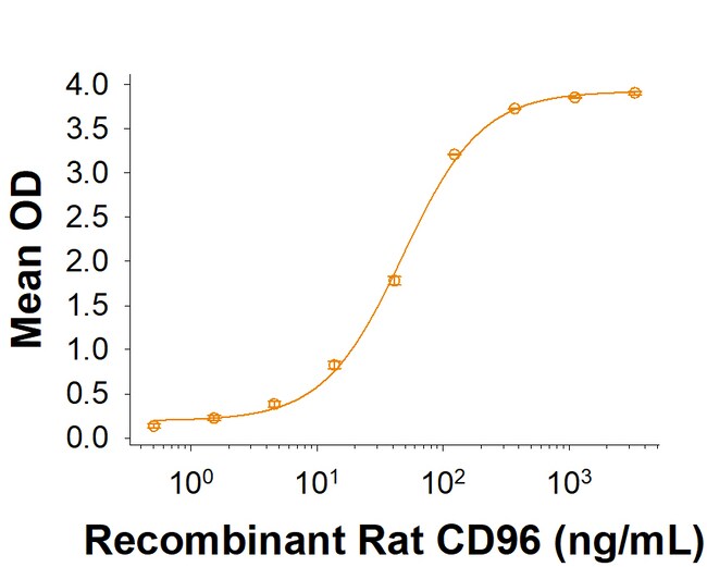 Measured by its binding ability in a functional ELISA. When Recombinant Rat CD155/PVR (Catalog # 9764-CD ) is immobilized at 1 μg/mL (100 μL/well), Recombinant Rat CD96 Fc Chimera (Catalog # 10400-CD) binds with an ED50 of 10-70 ng/mL