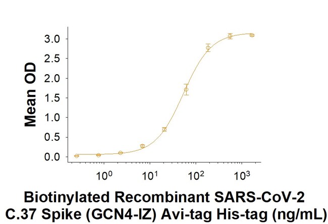 | Source | Human embryonic kidney cell, HEK293-derived sars-cov-2 Spike protein SARS-CoV-2 C0.37 Spike(Val16-Lys1211)(Gly75Val, Thr76Ile, RSYLTPG246-252 del, Asp253Asn, Leu452Gln, Phe490Ser, Asp614Gly, Thr859Asn) (Arg682Ser, Arg685Ser, Lys986Pro, Val987Pro)(N-terminus) Accession # YP_009724390.1 GCN4-IZ Avi-tag 6-His tag (C-terminus) |