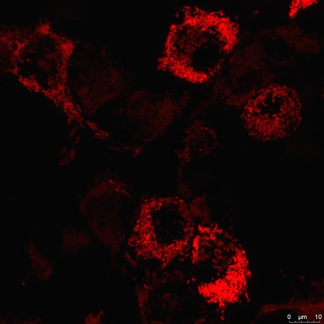 Bright, red fluorescent mitochondrial label for live-cell imaging—no fixation, staining, or cell lysis required. Visualize mitochondrial morphology and dynamics in real time, over hours to days, in living cells. Delivered via Montana Molecular’s Big Sky BacMam vector for enhanced expression across a wide range of cell types, including primary cultures and iPSCs. Targeted to mitochondria via Cox8. Ideal for dynamic, non-destructive studies of mitochondrial organization, cellular phenotypes, and high-content imaging.