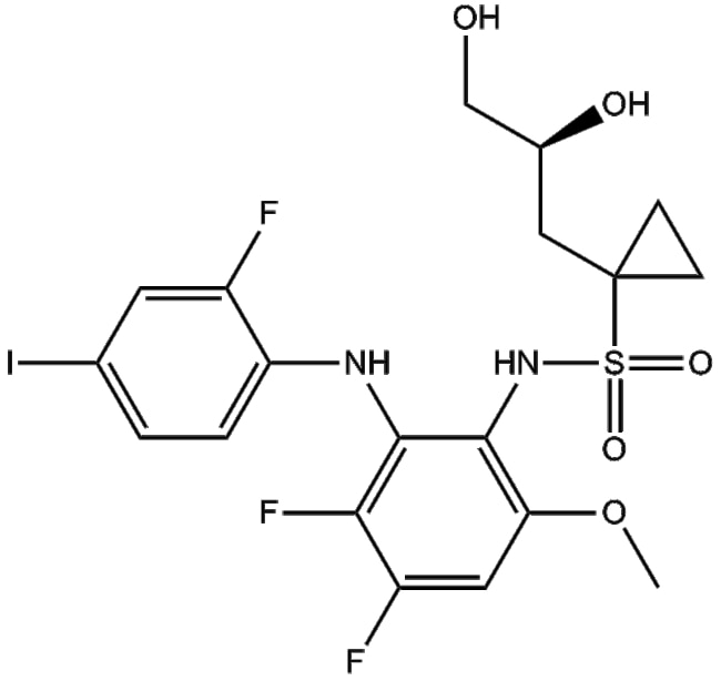 Refametinib (CAS 923032-37-5) is an orally bioavailable selective allosteric inhibitor of mitogen-activated protein kinase kinases MEK1 and MEK2 It binds to an allosteric site distinct from the ATP-binding pocket thereby inhibiting MEK1 and MEK2 enzymatic activity (IC50 19 nM and 47 nM respectively) and blocking phosphorylation of ERK without interfering with ATP binding Refametinib demonstrates potent inhibition in human tumor cell lines with EC50 values ranging from 2 5 to 15 8 nM and suppresses proliferation in BRAF V600E-mutant lines (GI50 67 89 nM) It induces tumor growth delay and regression in xenograft models supporting its utility in cancer research