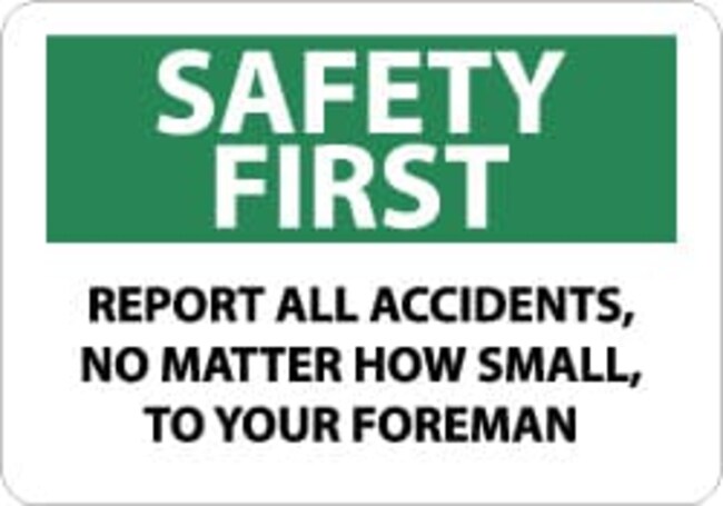 Inspecting, Testing & Data Sign: Rectangle, "REPORT ALL ACCIDENTS, NO MATTER HOW SMALL, TO YOUR FOREMAN"