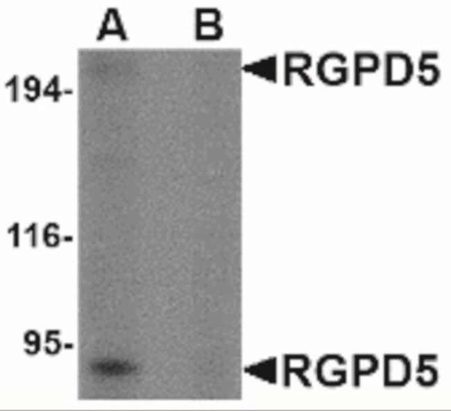 Antibody was raised against a 23 amino acid synthetic peptide from near the center of human RGPD5. The immunogen is located within amino acids 1130 - 1180 of RGPD5. Amino Acid Squence: DGDAKLERLAAKFKTPELAEEFK | |