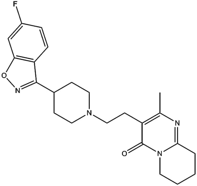 Risperidone (CAS 106266-06-2) is an atypical antipsychotic small molecule that functions predominantly as an antagonist at serotonin receptor subtype 5-HT2A and dopamine receptor D2 (D2DR) It exhibits high receptor binding affinity with inhibitory constants (Ki) of approximately 0 4 nM for 5-HT2A receptors and 3 13 nM for D2 receptors Due to these pharmacological properties risperidone serves as a valuable research tool to study neurotransmitter modulation and receptor signaling pathways associated with psychiatric disorders particularly schizophrenia and related psychoses