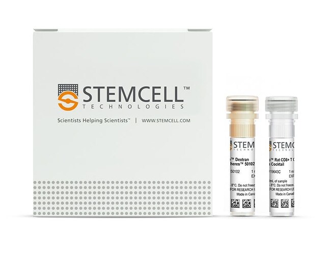 The EasySep Rat CD8 T Cell Isolation Kit is designed to isolate CD8 T cells from single-cell suspensions of splenocytes or lymph nodes or from whole blood by negative selection. The EasySep procedure involves labeling unwanted cells with antibody complexes and magnetic particles. The magnetically labeled cells are separated from the untouched desired cells by using an EasySep magnet and simply pouring or pipetting the desired cells into a new tube.