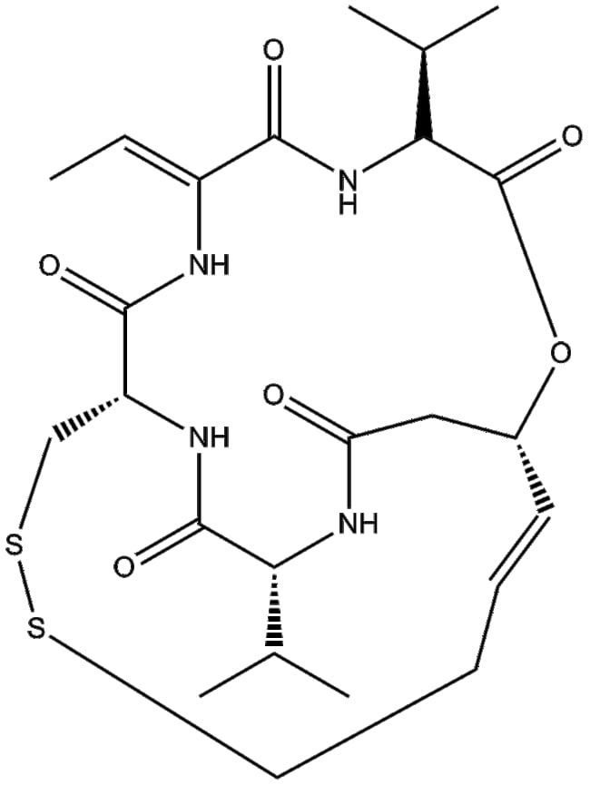 Romidepsin (FK228 depsipeptide CAS 128517-07-7) is a small-molecule inhibitor targeting histone deacetylases (HDACs) Initially isolated from Chromobacterium violaceum romidepsin preferentially inhibits class I enzymes HDAC1 and HDAC2 over class II HDAC4 and HDAC6 Inhibition of HDAC activity by romidepsin results in increased histone acetylation promoting transcriptional activation of tumor suppressor genes Mechanistically this compound can trigger cellular differentiation cell-cycle arrest apoptosis and altered gene expression in various malignancies Romidepsin serves as a research tool to investigate epigenetic regulation and has notable anticancer properties in cell models such as neuroblastoma and cutaneous T-cell lymphoma