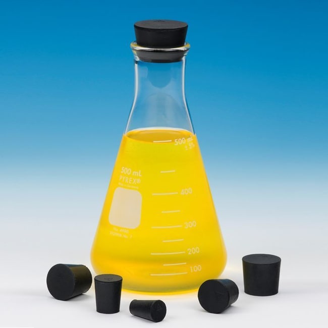 Solid Rubber Stopper, #10, Black. These stoppers are suitable for practically all general laboratory uses. Composition ensures resiliency and pliability over a long period and withstands laboratory conditions without hardening. The dimensions are in accordance with specifications established by the N.B.S. and are low in free sulfur (1/2%). Autoclavable at 250F for 30 minutes under water or steam conditions only (not dry heat). End user must test for their specific application. Diameter: Top (50mm), Bottom (42mm). Length: (25mm).
