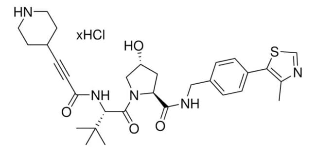Protein degrader building block (S,R,S)-AHPC-alkyne-piperidine enables the synthesis of molecules for targeted protein degradation and PROTAC (proteolysis-targeting chimeras) technology. This conjugate contains a von Hippel-Lindau (VHL)-recruiting ligand, a rigid linker, and a pendant amine for reactivity with a carboxylic acid on the target ligand. Because even slight alterations in ligands and crosslinkers can affect ternary complex formation between the target, E3 ligase, and PROTAC, many analogs are prepared to screen for optimal target degradation. When used with other protein degrader building blocks with a pendant amine, parallel synthesis can be used to more quickly generate PROTAC libraries that feature variation in crosslinker length, composition, and E3 ligase ligand.Technology Spotlight: Degrader Building Blocks for Targeted Protein DegradationPortal: Building PROTAC™ Degraders for Targeted Protein DegradationTargeted Protein Degradation by Small MoleculesSmall-Molecule PROTACS: New Approaches to Protein DegradationTargeted Protein Degradation: from Chemical Biology to Drug DiscoveryImpact of linker length on the activity of PROTACsPROTAC is a registered trademark of Arvinas Operations, Inc., and is used under license
