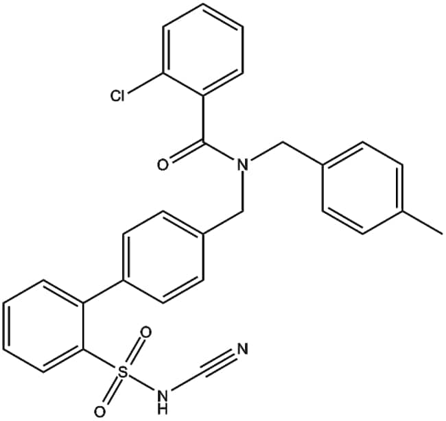 S0859 (CAS 1019331-10-2) is an N-cyanosulphonamide small molecule that reversibly inhibits Na -coupled HCO3 transporters (NBCs) central regulators of intracellular pH via bicarbonate ion flux S0859 displays a Ki of 1 7 M in suppressing NBC-mediated intracellular pH recovery with full inhibition observed near 30 M Disruption of NBC activity has been implicated in various pathological conditions including the up-regulation of NBCn1 in ErbB2-dependent breast cancer models and associations with hypertension In cellular assays S0859 treatment increased caspase-3 activation and apoptotic cell numbers This compound is valuable for studies investigating NBC function in cardiac and other physiological or disease contexts