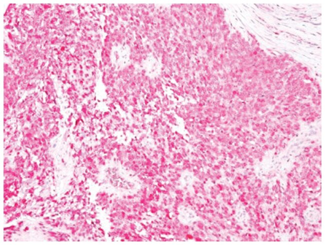 S100 belongs to the family of calcium binding proteins. S100A and S100B proteins are two members of the S100 family. S100A is composed of an alpha and beta chain whereas S100B is composed of two beta chains. S-100 protein has been found in normal melanocytes, Langerhans cells, histiocytes, chondrocytes, lipocytes, skeletal and cardiac muscle, Schwann cells, epithelial and myoepithelial cells of the breast, salivary and sweat glands, as well as in glial cells. Neoplasms derived from these cells also express S-100 protein, albeit non-uniformly. A large number of well-differentiated tumors of the salivary gland, adipose and cartilaginous tissue, and Schwann cell-derived tumors express S-100 protein. Almost all malignant melanomas and cases of histiocytosis X are positive for S-100 protein. Despite the fact that S-100 protein is an ubiquitous substance, its demonstration is of great value in the identification of several neoplasms, particularly melanomas and their metastases. |