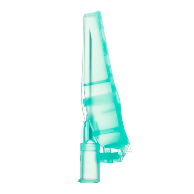 - Protective arm does not obstruct visualization of injection site; Bevel-up needle allows for low-angle injections