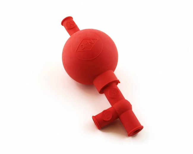 Our safety pipette filler is made of 100% natural rubber for best chemical resistance. Air flow is controlled with polished glass ball valves that will not corrode or freeze up. Pipette fillers are easy to clean when necessary by repeated flushing. Colors are permanently molded into the rubber and will not fade or leach. Pipette fillers are easy to use. First expel air by squeezing valve A on the top of the bulb. Fill pipette by squeezing valve S on stem. To dispense from the pipette squeeze valve E on the side of the stem.
