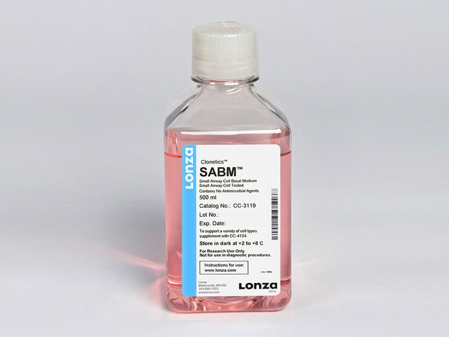 SABM is a basal medium sold separately. This is used as a component in the full SAGM Small Airway Epithelial Cell Growth Medium BulletKit (catalog number CC-3118) which consists of basal and supplements packaged together. SAGM BulletKit is serum-free and has been optimized to grow human small airway epithelial cells (SAEC).Content:1 x Bottle Basal Medium 500 mL